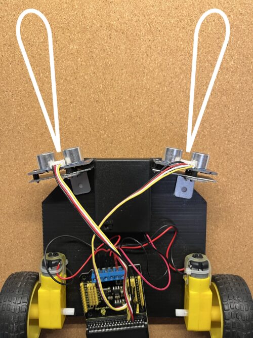 2個の超音波センサをロボカーの左右に取り付け、前方の物体との距離をそれぞれのセンサで測定し、その差に基づき進行方向を調整するようにすれば、受講生のつくりたい「自分についてくる車」を実現できそうです。