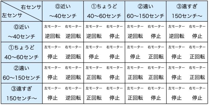 受講生からは「ロボカーが自分に近づいてくるだけでなく、自分がロボカーに近づきすぎた時にはロボカーが逃げるようにしたい」という要望もありましたので、以下のような仕様でロボカーの進行方向を制御するようにしました。