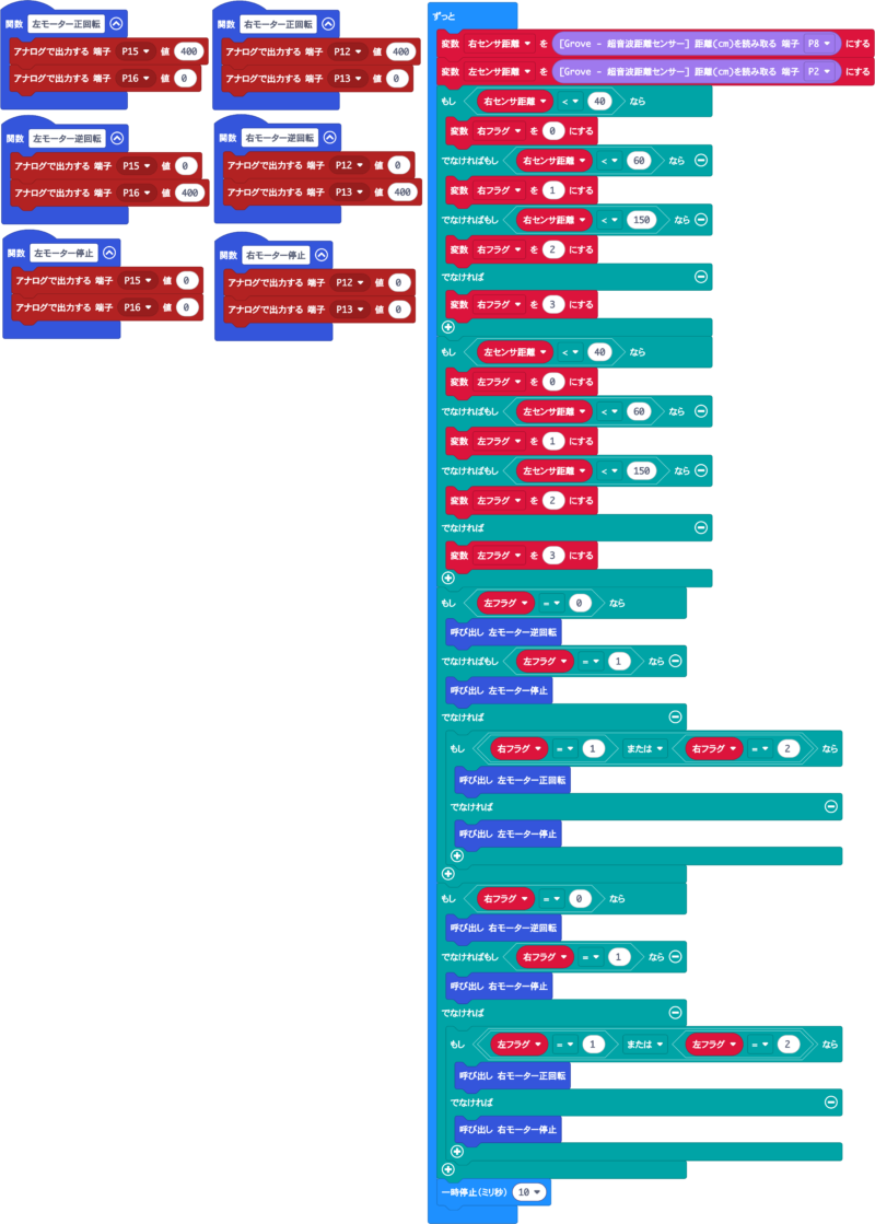 それぞれのセンサの測定結果に基づき、先ほどの仕様どおりにふたつのモーターを制御しているだけの単純なプログラムです。