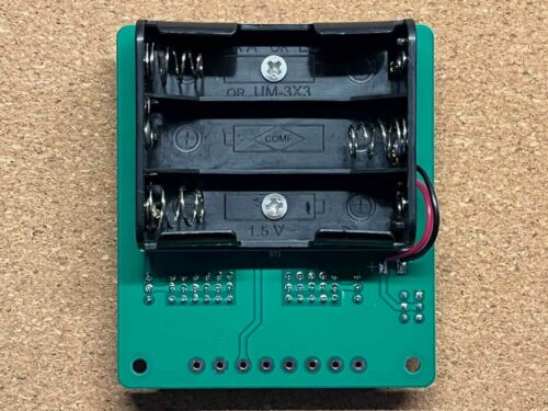 基板の裏に「単三×3本の電池ボックス」を固定しています。これで電池ボックスの配線が切れてしまう心配はなくなります。
