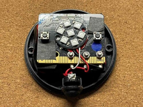 このような感じで、マイクロビットとフルカラーLEDをランタンの中に詰め込みました。そのままの状態では微妙に入らず、周囲のプラスチックを削ったりしてなんとか押し込みました。