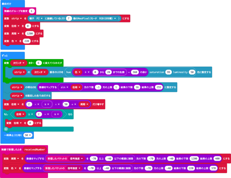 もう1台のマイクロビットから定期的に発信される無線を受信し、その信号強度によってLEDの点灯色と明るさを変更します。