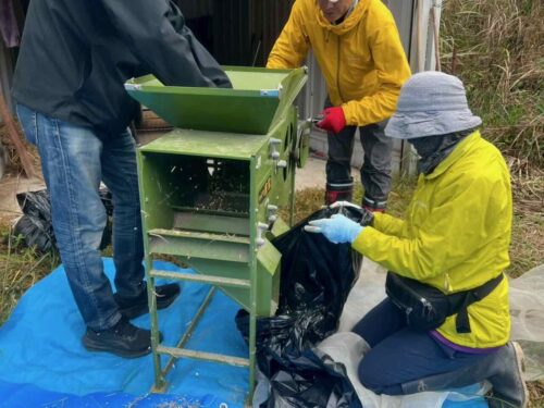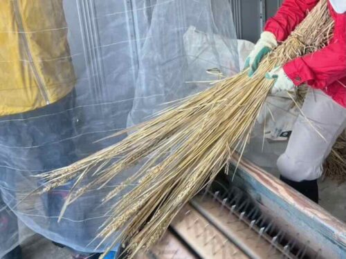 「足踏み脱穀機」で脱穀し、その後「唐箕」でゴミを吹き飛ばし、コメを選別します。
